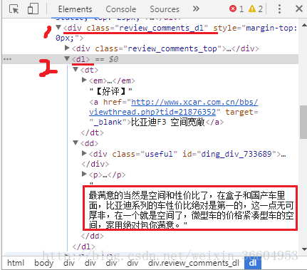 我们可以看到红框3中有很多相同的标签<dl>...</dl>,他们都是属性名为’class’,属性值为’review_comments_dl’的’div’标签的子标签,他们之间互为兄弟标签,我们把鼠标放在红框3的位置并选中,这时左侧网页的第一条口碑的位置就会变成深色背景,也就是说,红框3这个标签实际上对应着红框2这个区域中的内容,那么我们把红框3再具体的看一看。如下图所示。
