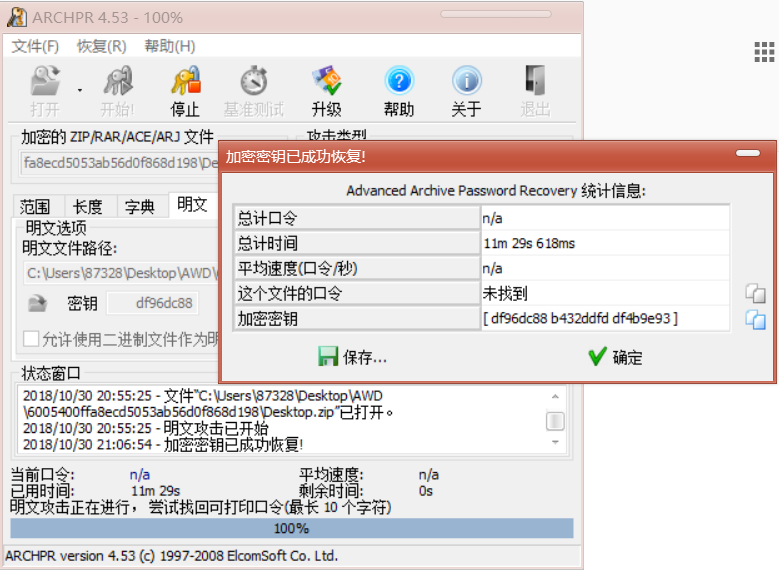 首先这题我建议大家下 ARCHPR 4.53 版本,我是在这个版本下测试成功的。成功截图如下: