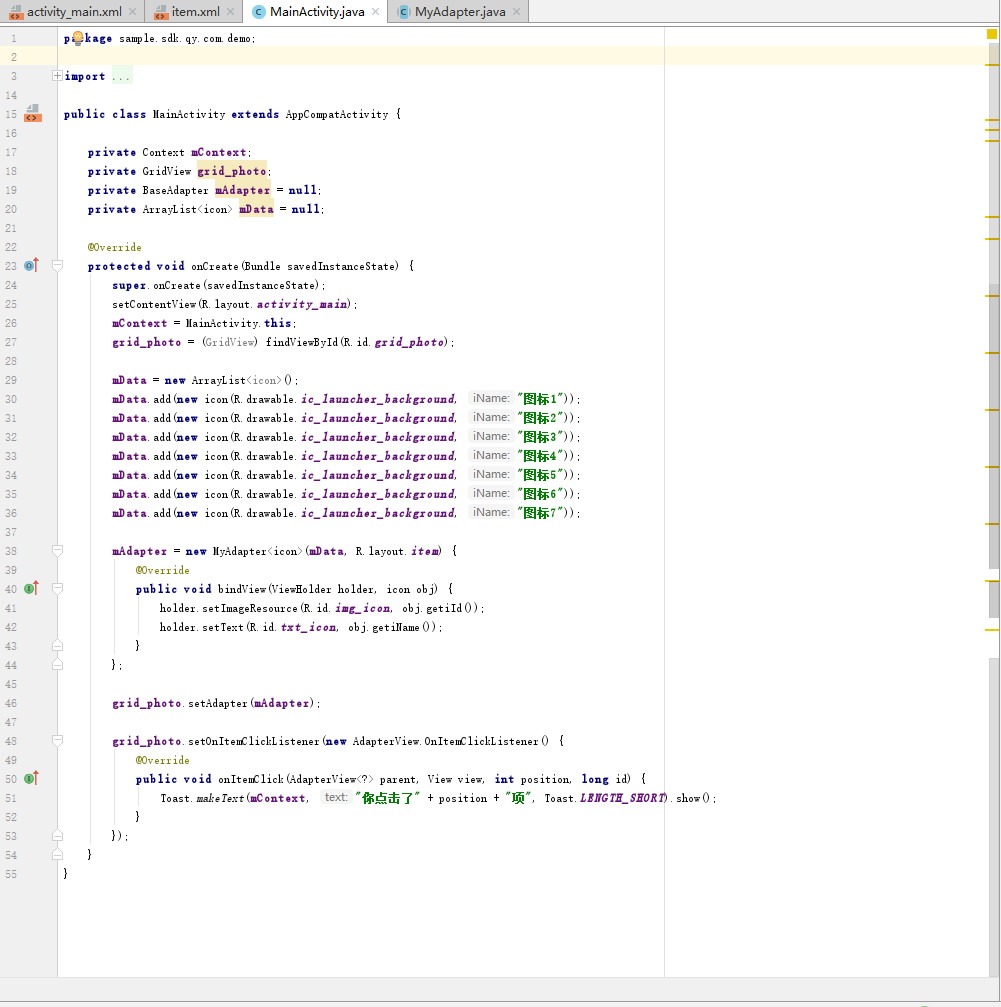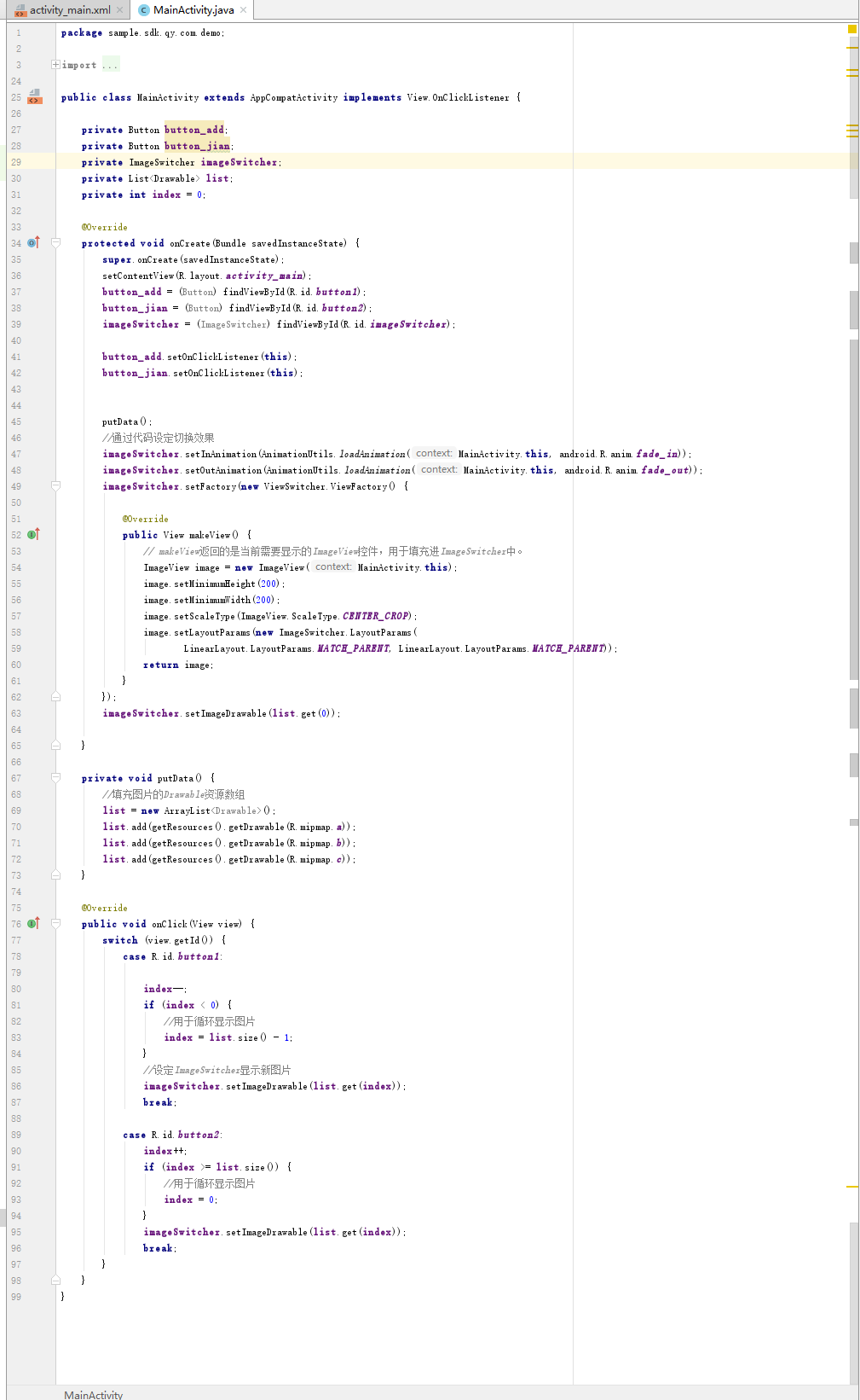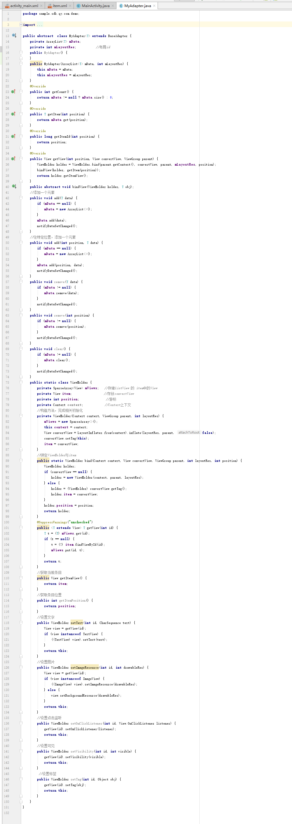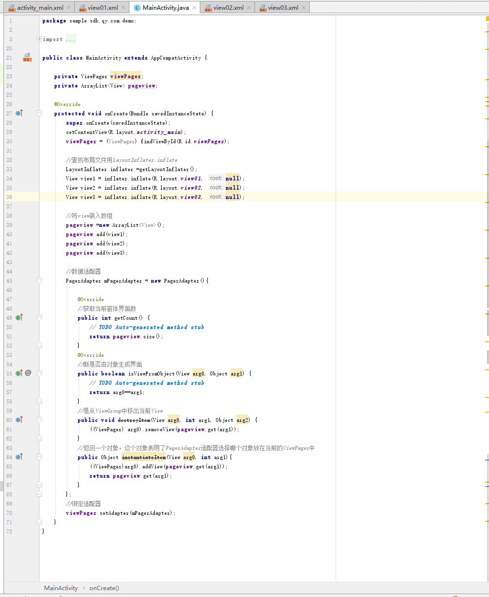 这里用到了适配器,后面会对其进行讲解,关于ViewPager,后期会写3D画廊,是其进阶版