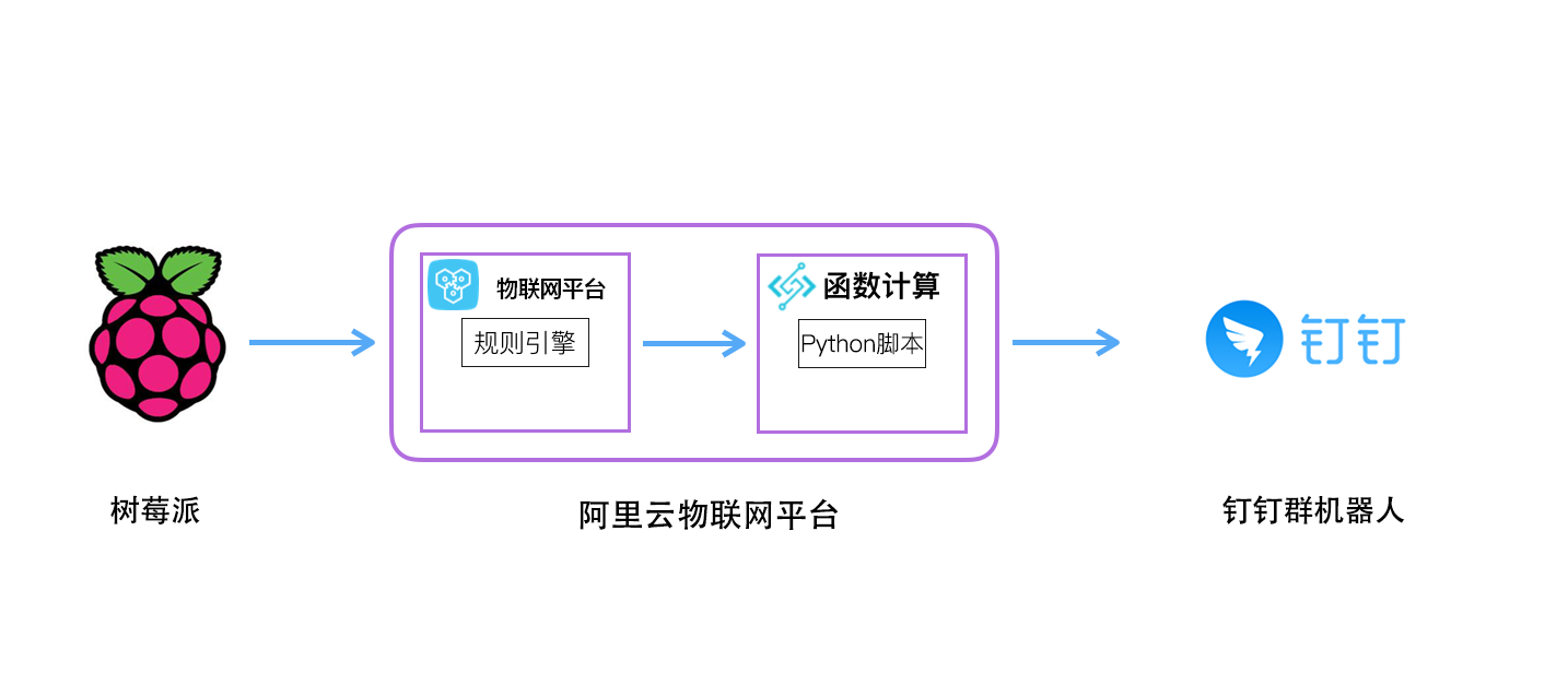 本文通过一个简单实例,主要介绍了如何使用树莓派快速接入阿里云iot platform,并实现了一个简易的监控人员出入并拍照上送钉钉群的场景