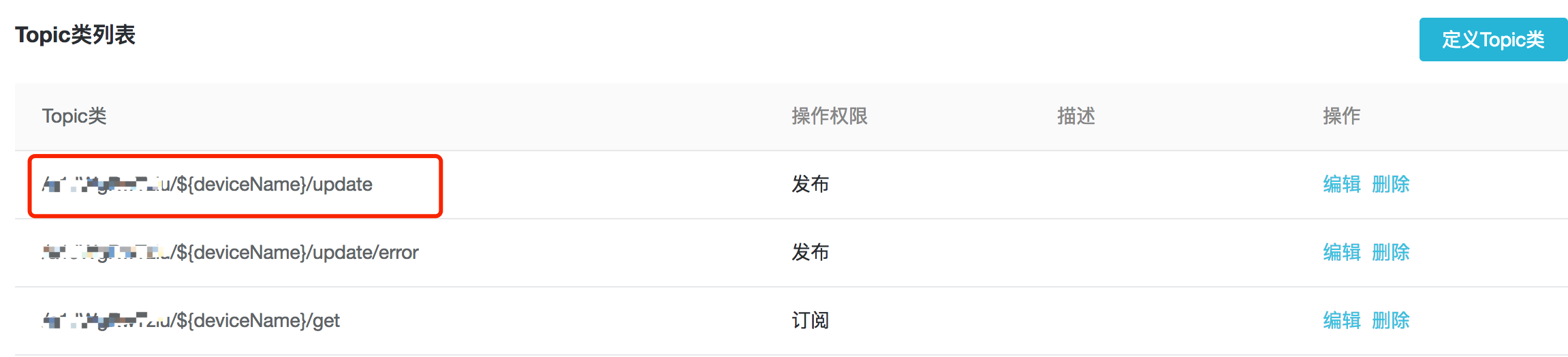 系统会自动创建3个Topic,我们需要使用 /ProductName/${deviceName}/update,作为设备告警消息的上送的Topic。