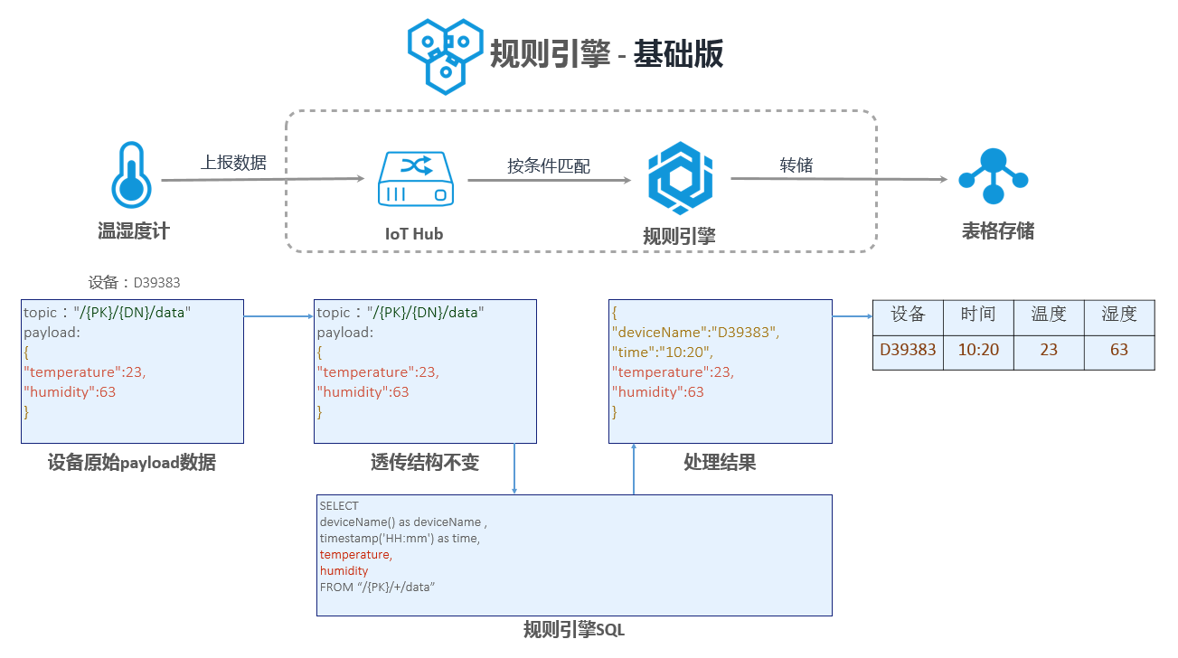 设置规则引擎的意义在于,可以将设备上送的消息数据,通过配置转发规则将处理后的数据转发到阿里云其他服务,例如RDS、TBS和函数计算等等。我们需要注意的是从设备端到规则引擎处理后的JSON数据格式的变化,下图中是基础版的演变过程: