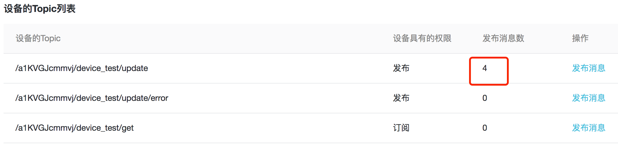 在设备的Topic列表中,也可以看到发布的消息个数