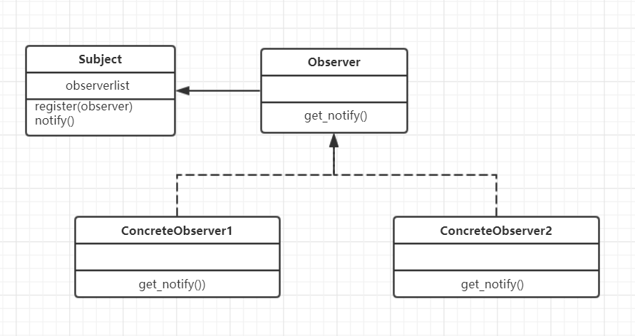 Observer为观察者定义了一个接口,里边定义了观察者获得通知的方法,ConcreteObserver(具体观察者)实现这些接口,并与主题创建相关联系,Subject主题存储所有注册的观察者,并向所有观察者发送新消息。