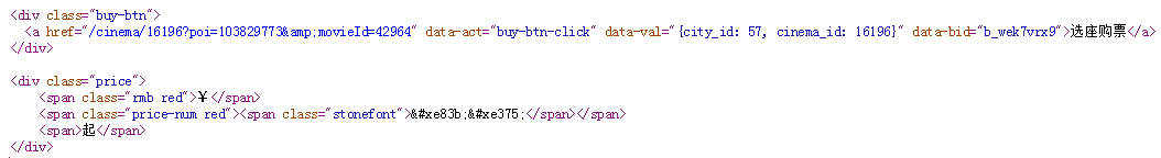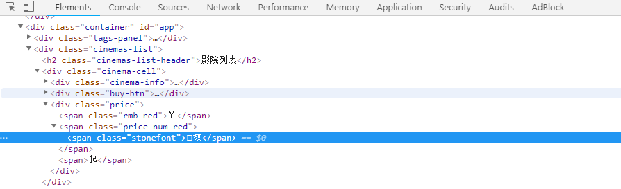 首先打开猫眼电影,然后点击一个正在热播的电影(比如:毒液)。打开开发者工具,点击左上角的箭头,然后用鼠标点击网页上的票价,可以看到源码中显示的不是数字,而是某些根本看不懂的字符,这是因为使用了font-face定义字符集,并通过unicode去映射展示,所以我们在网页上看到的是数字,但是在源码中看到的却是别的字符。