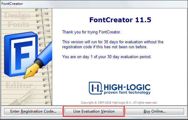 当我下载好字体文件后,满心欢喜的双击想要点开的时候,却发现无法打开(T_T)。查阅资料之后知道了一个叫做FontCreator的软件,用这个软件可以打开我们下载的字体文件,没有安装这个软件的可以进入官网https://www.high-logic.com/下载安装,如果下载得很慢的可以用百度云下载(链接:https://pan.baidu.com/s/1ImxwPhKdzZo2g4bIjiGCZw ,提取码:m0yf )。下载好之后打开软件,看到如下界面,选择Use Evaluation Version,这个软件我们可以免费使用三十天。