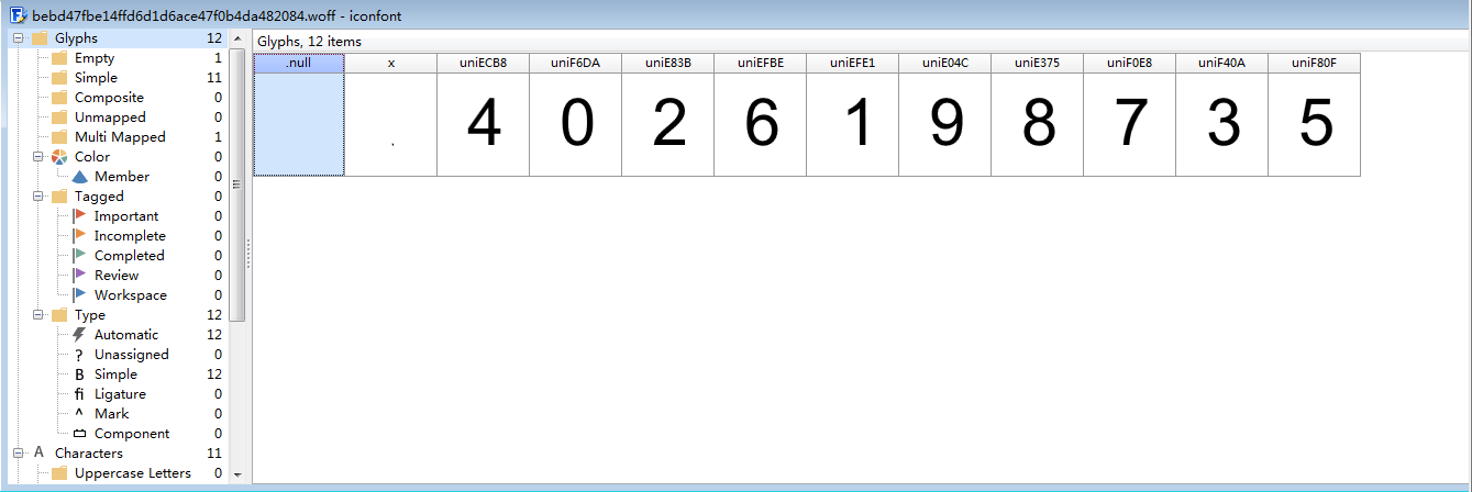 打开软件后,再打开我们下载的字体文件,可以看到数字2和8分别对应的是uniE83B和uniE375,和前面看到的编码是一致的。