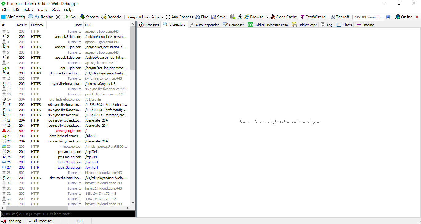 打开后,Fiddler会自动捕获所有HTTP会话信息。