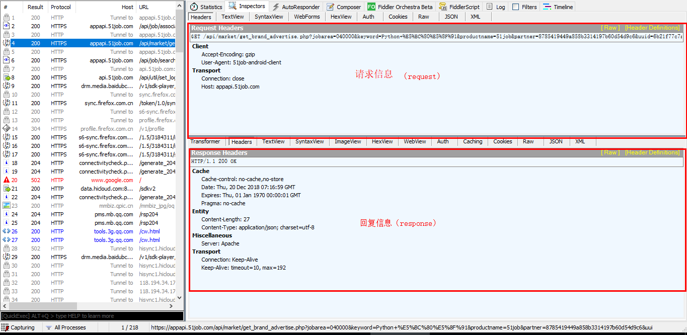 Fiddler界面右侧是用来显示选中数据报的详细信息,上半部分显示的是数据报的请求信息,下半部分显示的是回复信息: