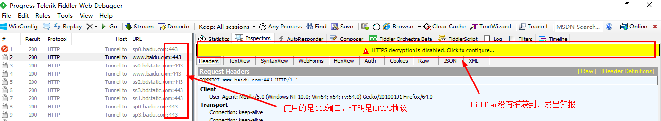 完成上述设置之后可以捕获HTTP协议下的会话信息,但现在的很多网站都采用HTTPS协议,用Fiddler不会就会出问题。百度首页采用的就是HTTPS协议,如下图所示,当我们尝试使用Fiddler不会访问百度首页时,出现捕获失败: