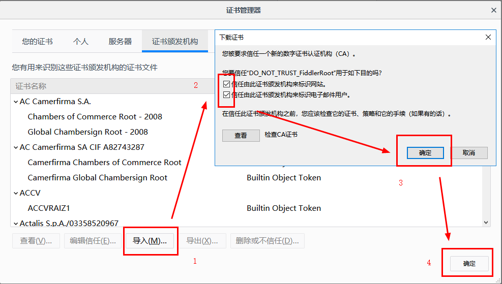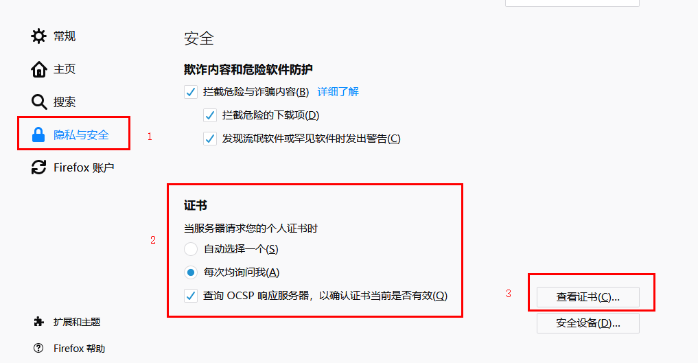 第三步:打开firefox浏览器,选项-隐私与安全,在最下面找到证书设置项,点击“查看证书”,导入在第二步中到处到桌面的证书,勾选两个信任之后确认退出。