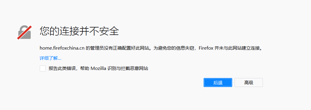 有的网上教程说到此点击OK就可以了,但事实证明,如果就设置到这一步,打开HTTPS网页会失败,出现警告“您的连接并不安全”,如下图所示。所以还要进行第二步操作。