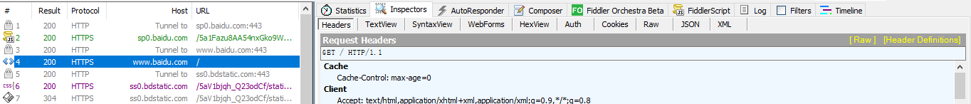 此时,再次打开百度首页,查看Fiddler捕获的信息,发现可以正常访问百度,且Fiddler没有报警报信息,且成功捕获如下所示:
