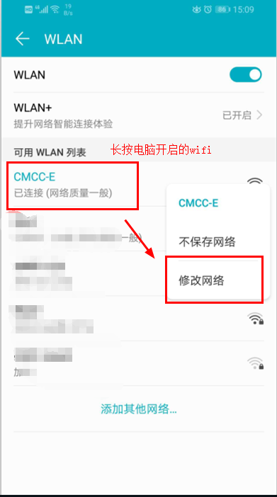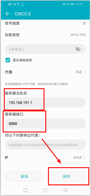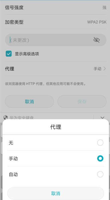 第三步:到手机中将手机的网络代理改为电脑的fiddler。首先查看电脑的ip地址,然后在手机中一次打开“设置-无线和网络-wlan”,连接上电脑上刚创建的无线网,然后长按该无线网,依次点击“修改网络-显示高级设置-代理-手动”,将服务器主机名设置为电脑的ip地址,端口设置为8888。如下图所示: