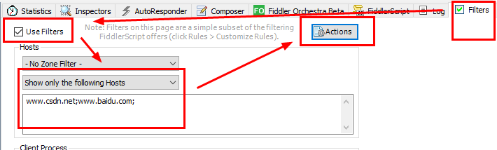 如果要设置多个域名,域名之间用分号分开。切记,选好后要点击Actions按钮,然后点击Runfiltersets now让设置生效。如果我们只想显示百度和CSDN的会话信息,设置过程如下图所示: