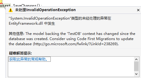 }发现在数据库已经建好了相应的表,这时在people类增加Sex属性,随便增加一条数据执行代码,报了如下错,很显然EF并不会帮我们更新数据库结构: