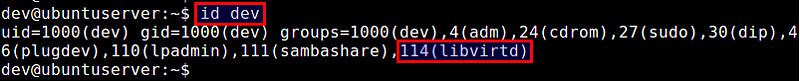 安装期间,libvirtd 用户组(在 debian 上是 libvirtd-qemu 用户组)将会被创建,并且你的用户 id 将会被自动添加到该组中。这样做的目的是让你可以以一个普通用户而不是 root 用户的身份去管理虚拟机。你可以使用 id 命令来确认这一点,下面将会告诉你怎么去显示你的组 id: