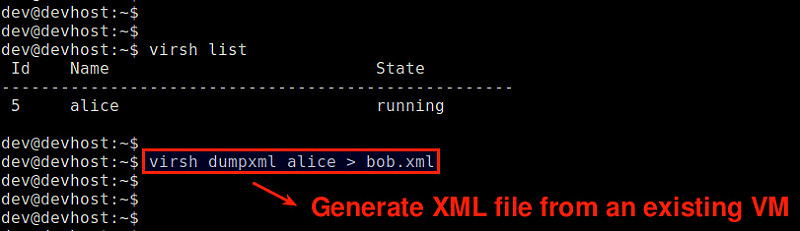 生成一个主机 xml 配置文件的方式就是通过一个已经存在的虚拟机来导出它的 xml 配置文件。如下所示。