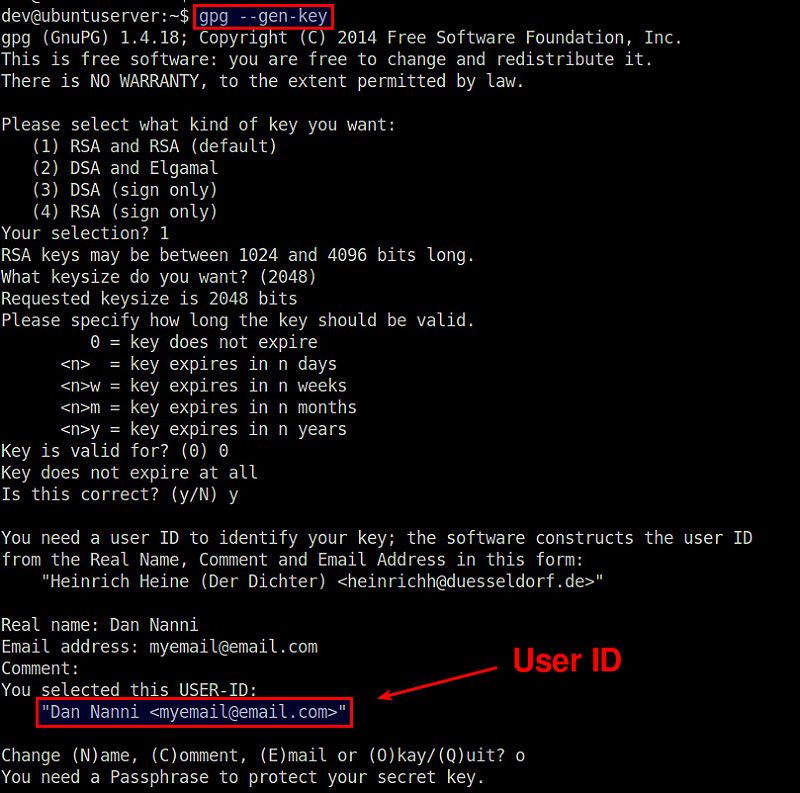 选择密钥类型(RSA),密钥长度(2048 bits),和过期时间(0 代表不过期)。当出现用户 ID 提示时,输入关联到该公钥/私钥对的名字(Dan Nanni) 和邮箱地址(myemail@email.com)。最后,输入一个密码来保护你的私钥。