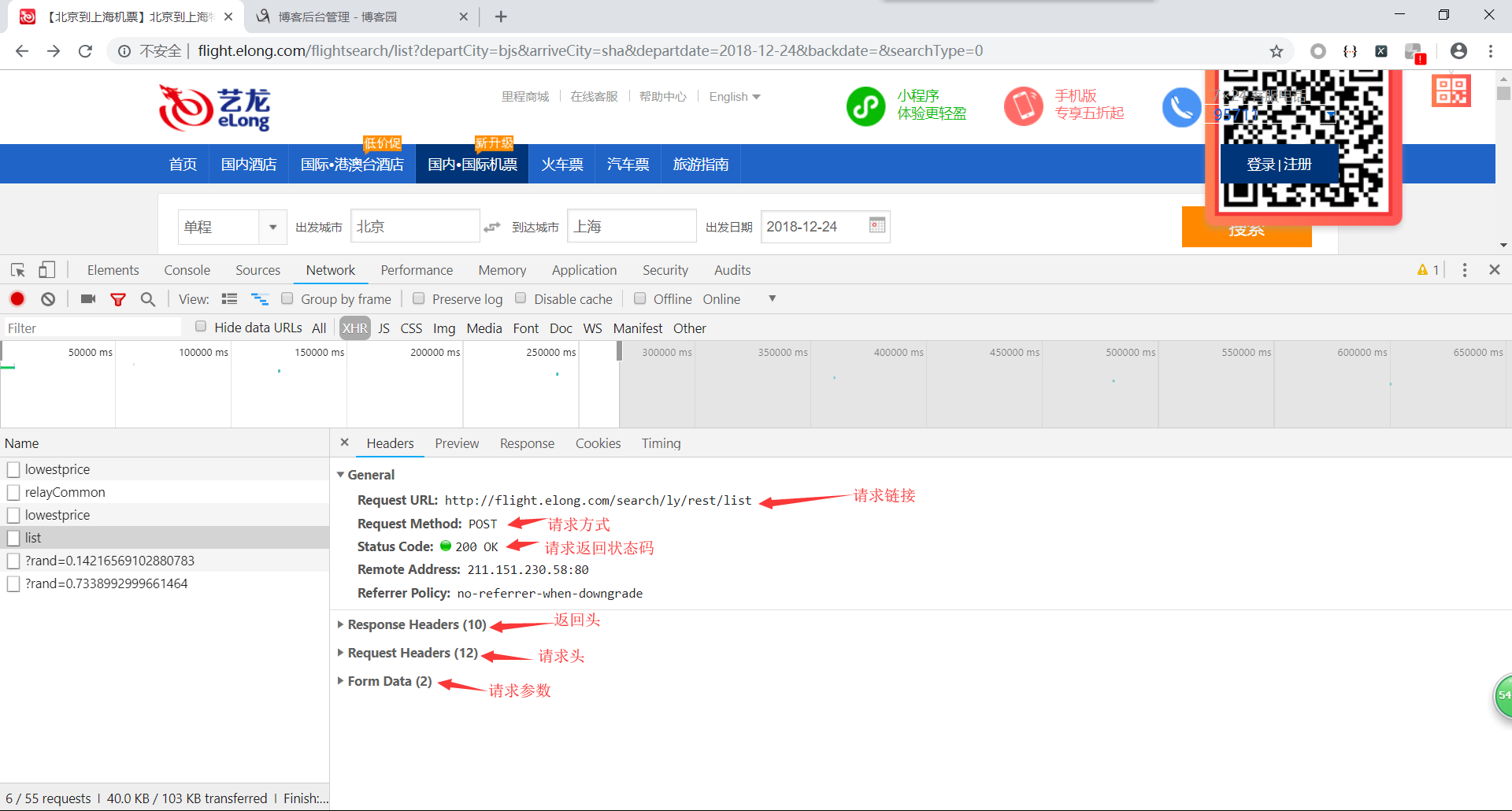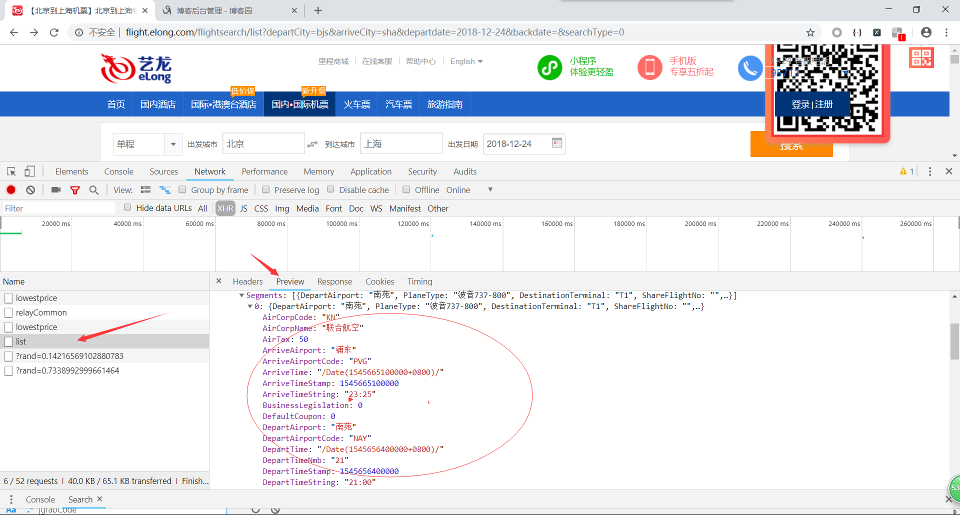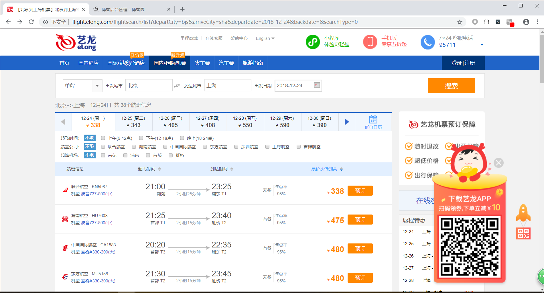 进入艺龙机票列表搜索页,附上链接http://flight.elong.com/flightsearch/list?departCity=bjs&arriveCity=sha&departdate=2018-12-24,链接参数日期自行更改。