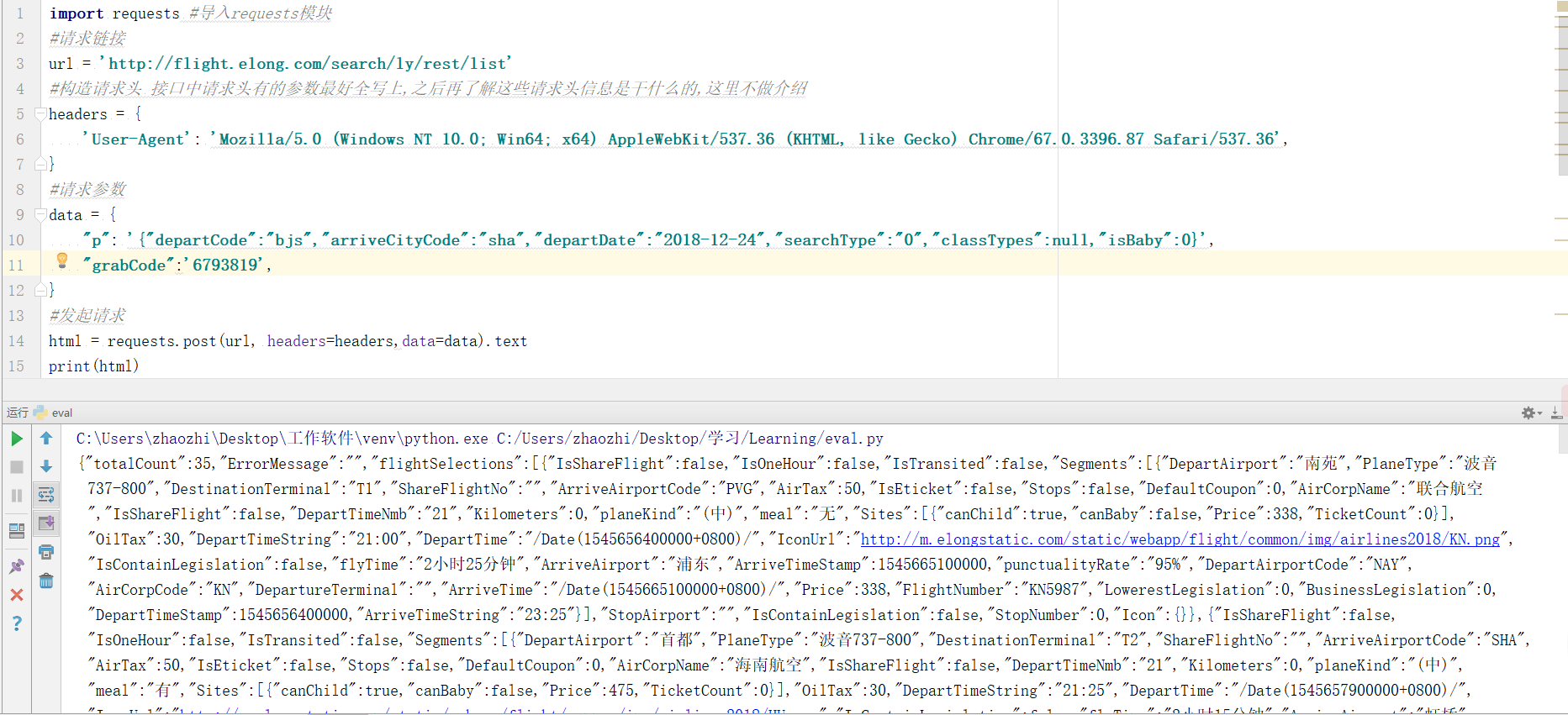 import requests #导入requests模块import json #导入json#请求链接url = 'http://flight.elong.com/search/ly/rest/list'#构造请求头 接口中请求头有的参数最好全写上,之后再了解这些请求头信息是干什么的,这里不做介绍headers = { 'User-Agent': 'Mozilla/5.0 (Windows NT 10.0; Win64; x64) AppleWebKit/537.36 (KHTML, like Gecko) Chrome/67.0.3396.87 Safari/537.36',