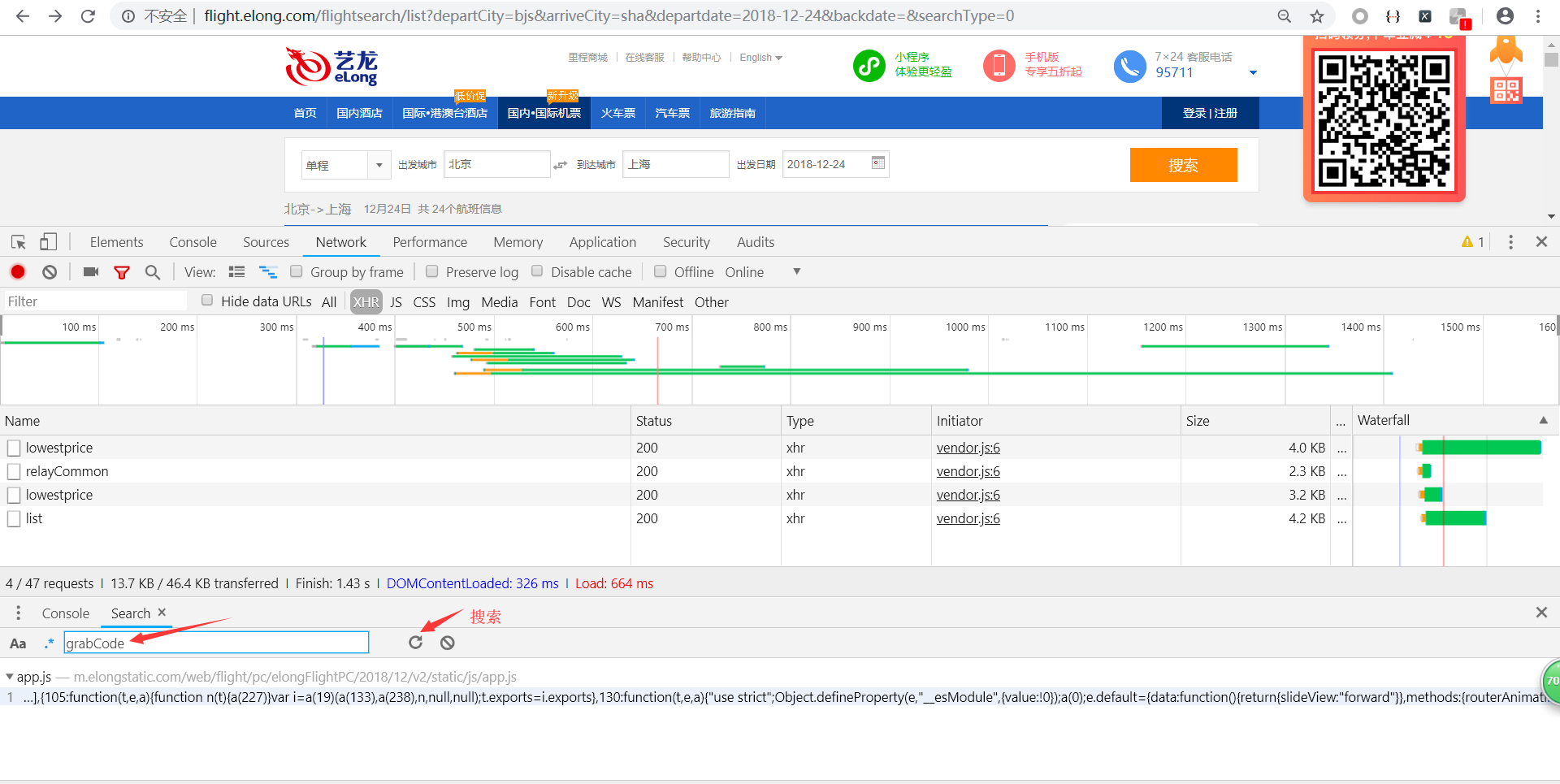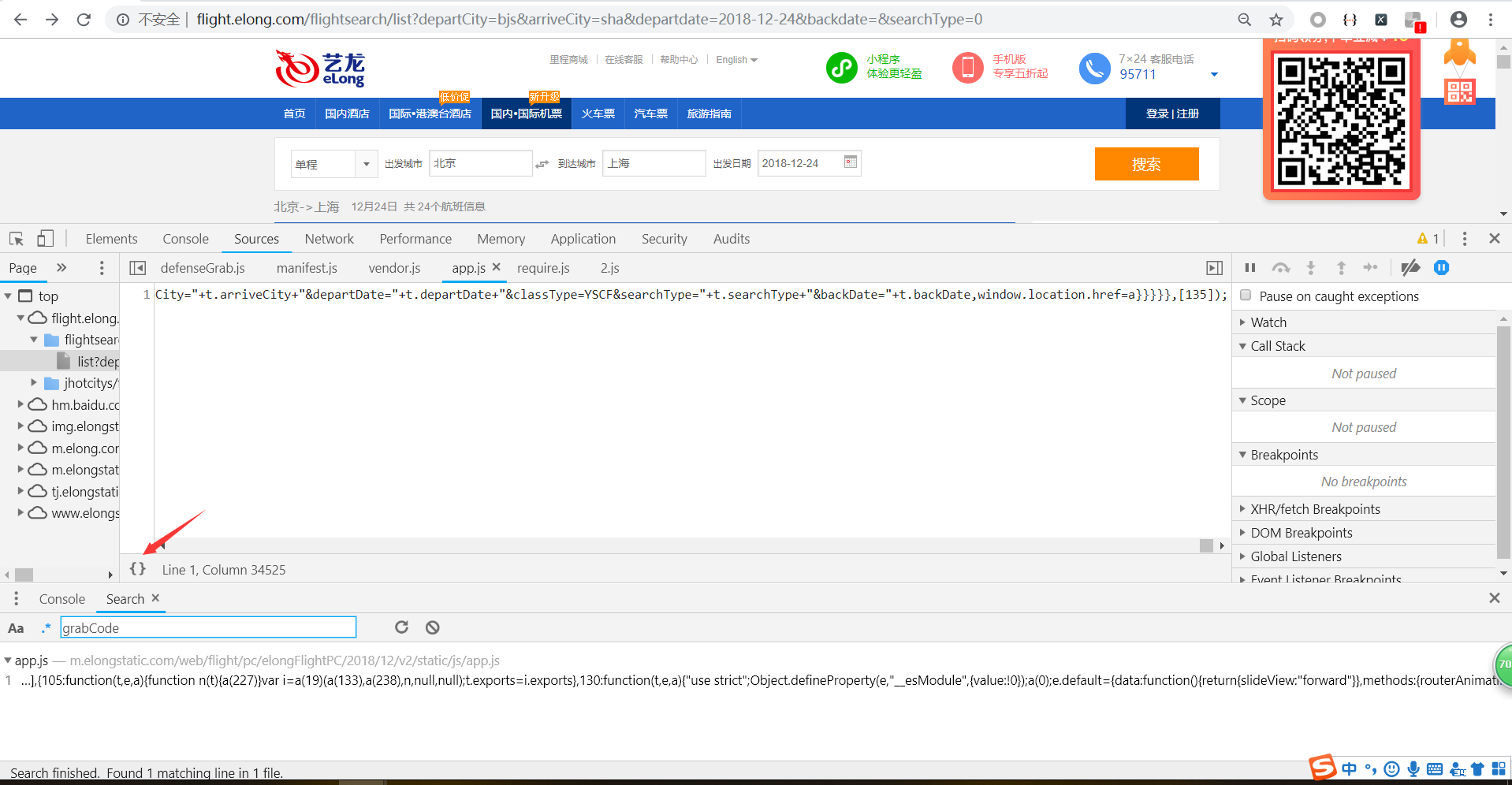 通过关键字grabCode,来查找js调用接口的位置。(这里也可以通过其他方法如请求方式Post来搜索位置)