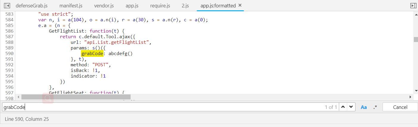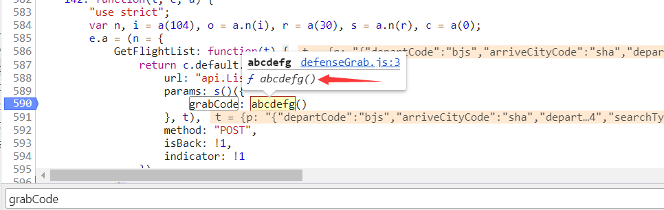 grabCode的值是调用了abcdefg函数。(下面我们可以用js断点调试来获取函数abcdefg的位置,或是按照刚才的方法使用全局搜索来查找也可以,调试更方便一点)