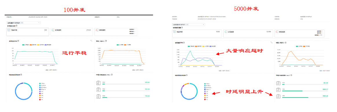 a) 系统性能到达瓶颈,持续并发加压过程中响应时延增加(可观察响应区间统计)