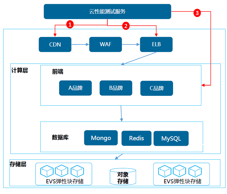 对于网络架构复杂的应用,可以通过网络架构上的分段验证,如分别从最外端的CDN入口(1)中间的ELB(2)业务层(3)分别做测试,验证网络架构上的瓶颈和影响