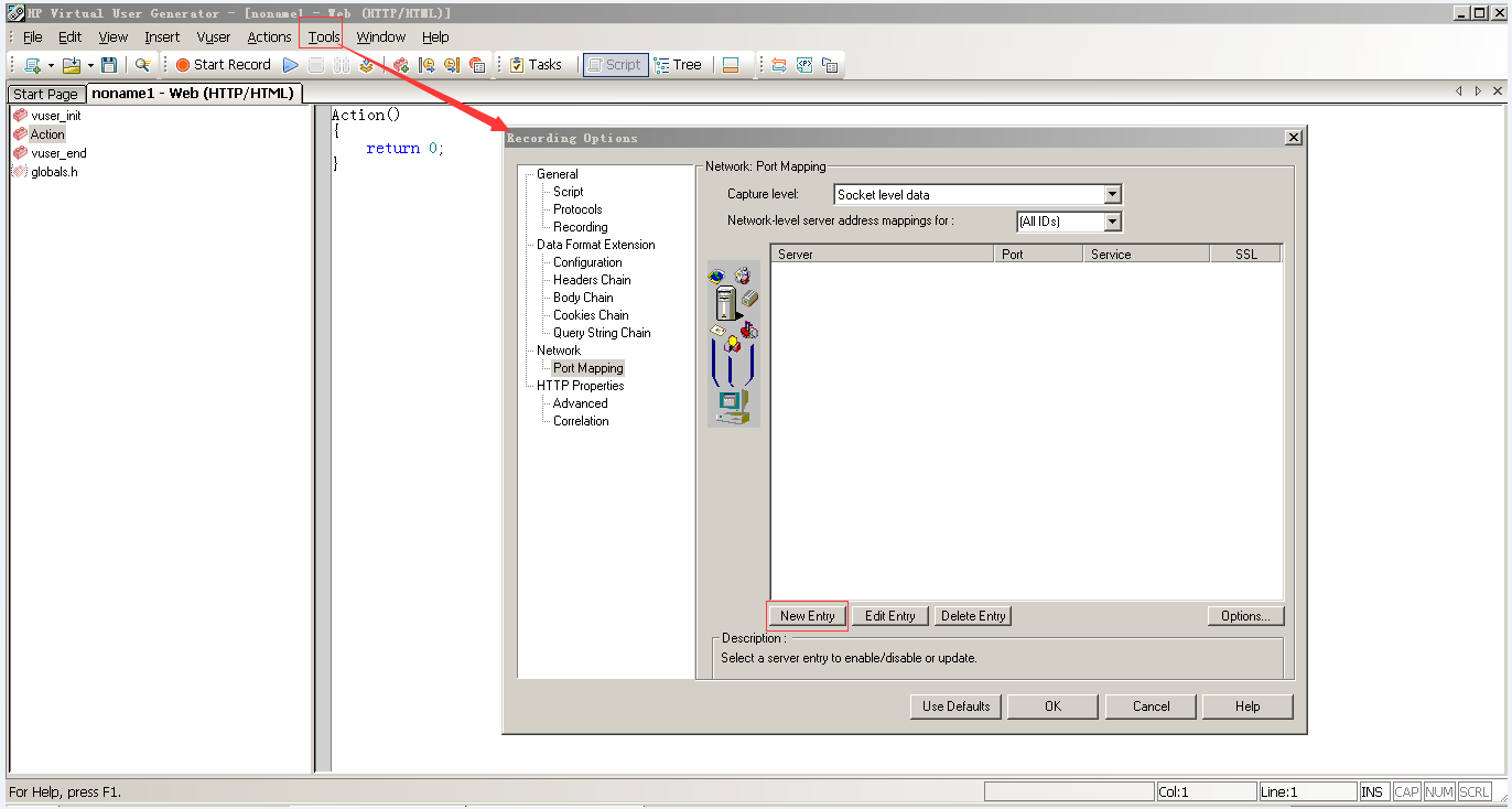 2、选择菜单中的tools->Recording Options进行Network->Port Mapping的配置;