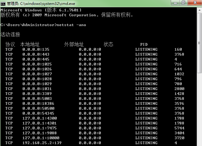 注意:如果不知道哪些端口被占用过,可以进行如下操作:开始->输入cmd->命令弹窗中输入netstat -ano,会列出所有已占用的端口。