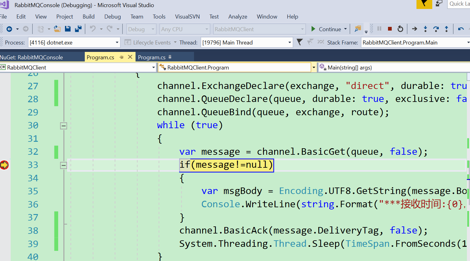 { var message = channel.BasicGet(queue, true); #第二个参数说明自动释放消息,如为false需手动释放消息 if(message!=null)