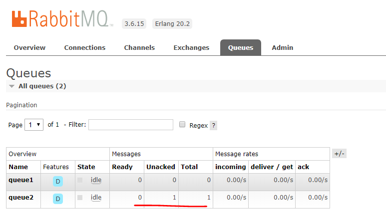 这么说来只要不走到 channel.BasicAck(message.DeliveryTag, false);这一行,消息就不会被释放掉,我们让程序直接走到这一行代码,查看一下消息的状态