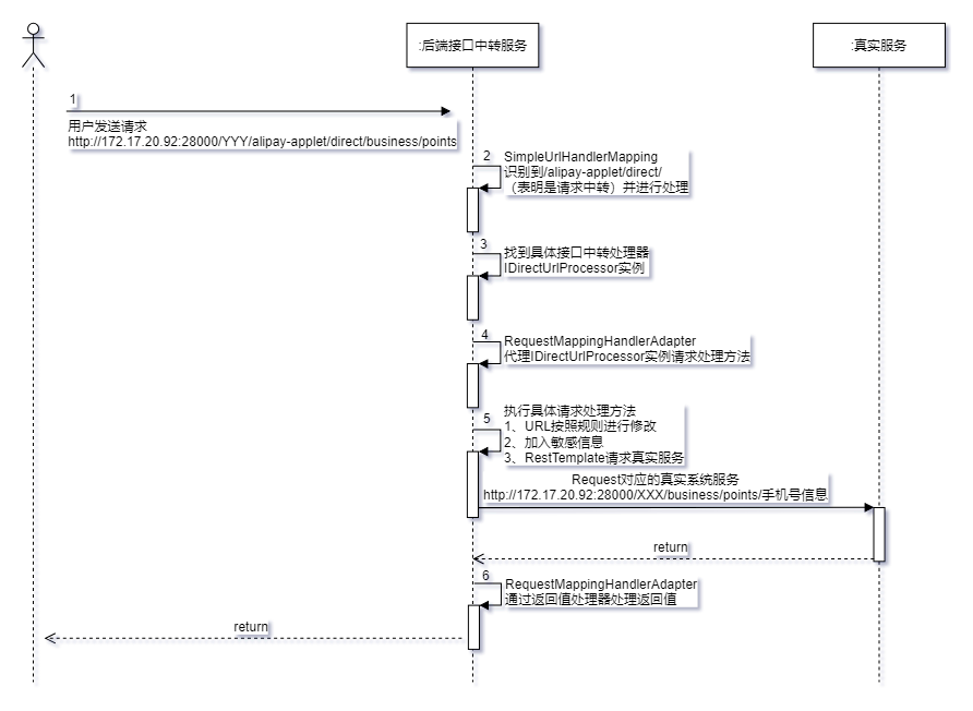 接口中转器扩展方便,只要按照如上方式根据不同类型的request实现具体的接口中转处理器就可以了。另外就是接口文档了,有了接口中转处理器,只需要改一下真实服务的接口文档就可以。比如真实服务的请求地址是http://172.17.20.92:28000/XXX/business/points/手机号信息,只需要改成http://172.17.20.92:28000/YYY/alipay-applet/direct/business/points。【手机号信息是敏感信息,需要后端从会话信息中获取】。还有,不要问我为啥要花时间设计这个东西,第一领导同意了,第二开发周期理想,第三我喜欢!!!
