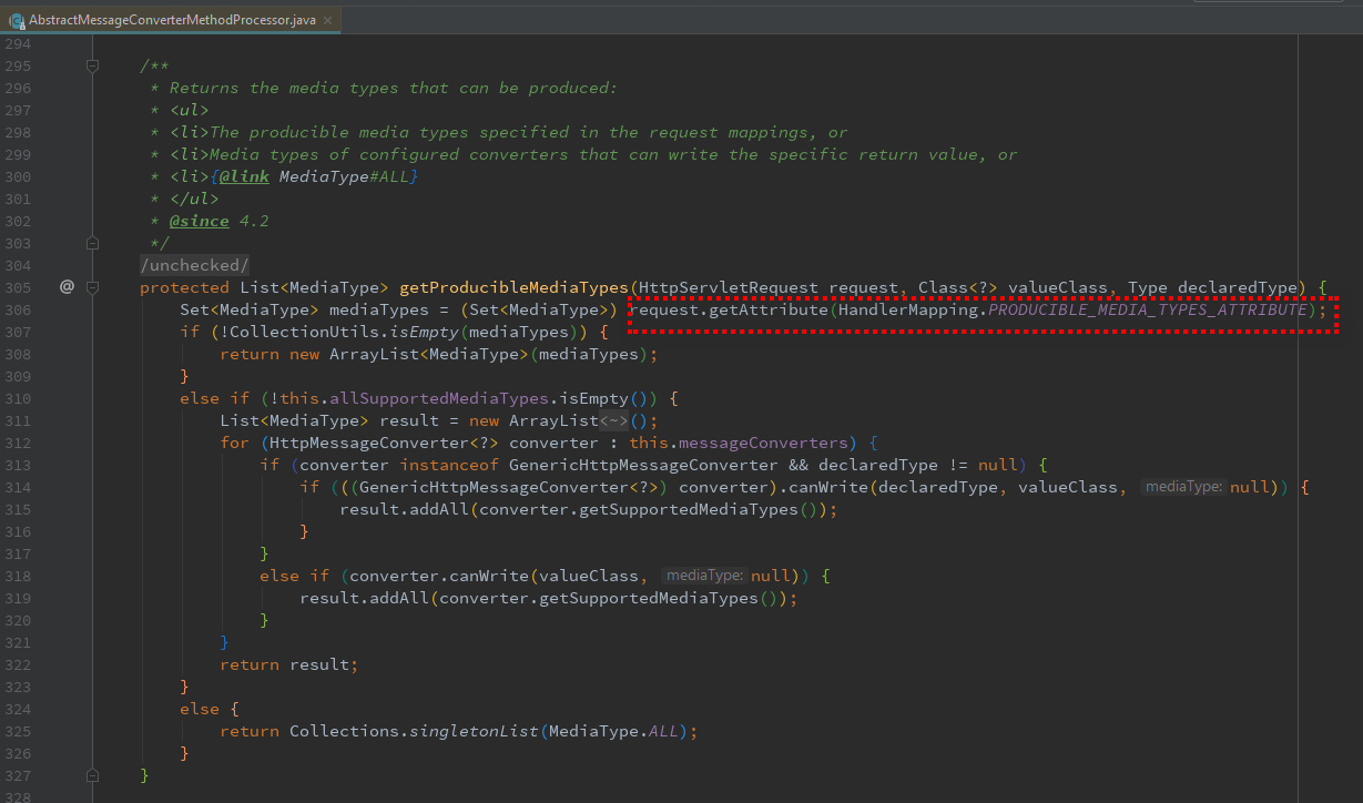 我手动设置的原因是因为RequestMappingHandlerAdapter是和RequestMappingHandlerMapping配合使用的,RequestMappingHandlerMapping会在request的attribute中设置RequestMappingInfo.producesCondition.getProducibleMediaTypes()这个值。具体参考代码如下。