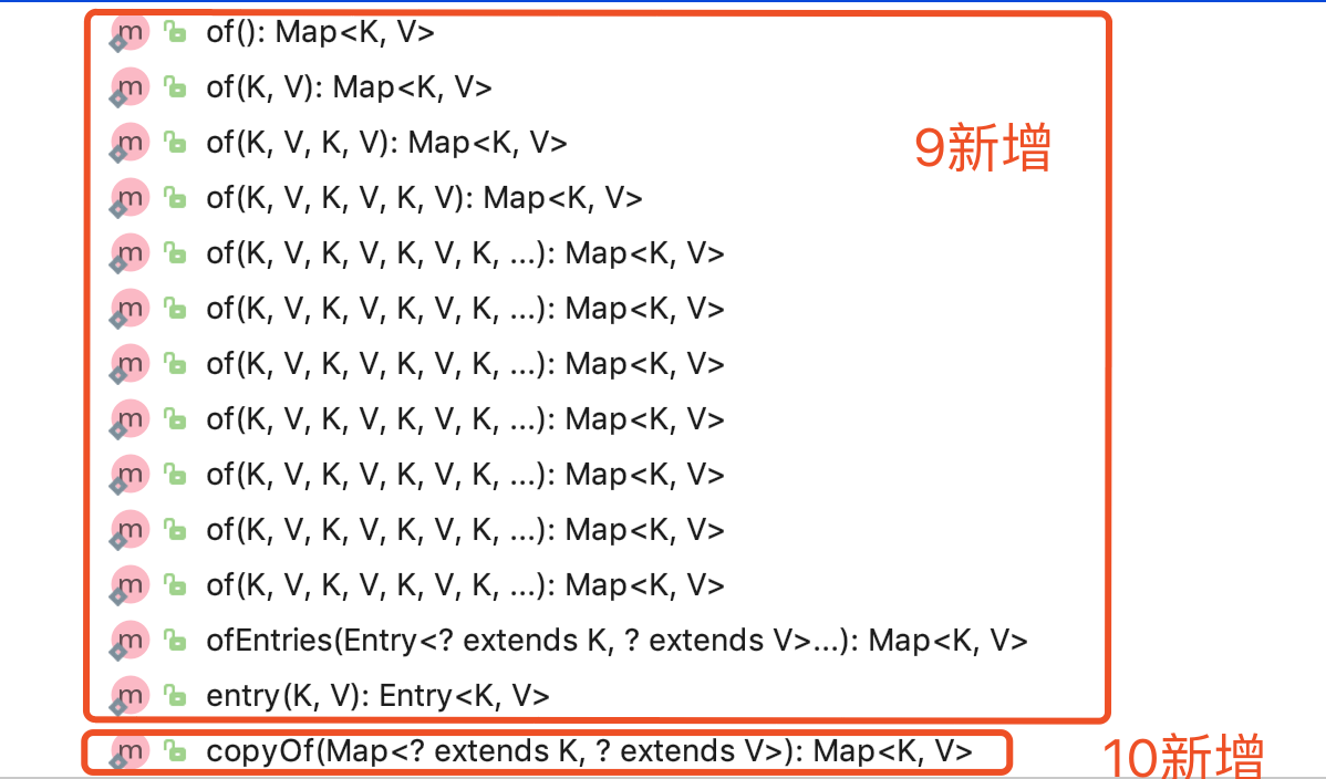 of()方法分别返回包含 0 - 9 个键值对的不可修改的Map;ofEntries()方法返回包含从给定的entries总提取出来的键值对的不可修改的* Map(不会包含给定的entries);entry()方法返回包含键值对的不可修改的 Entry,不允许 null 作为 key 或 value;copyOf()返回一个不可修改的,包含给定 Map 的 entries 的 Map ,调用了ofEntries()方法.