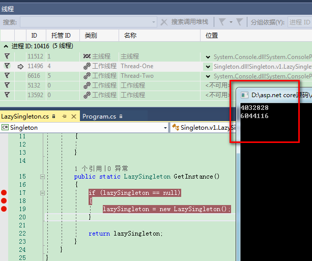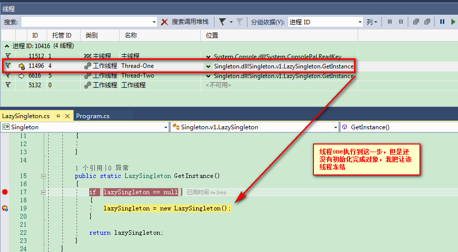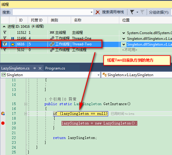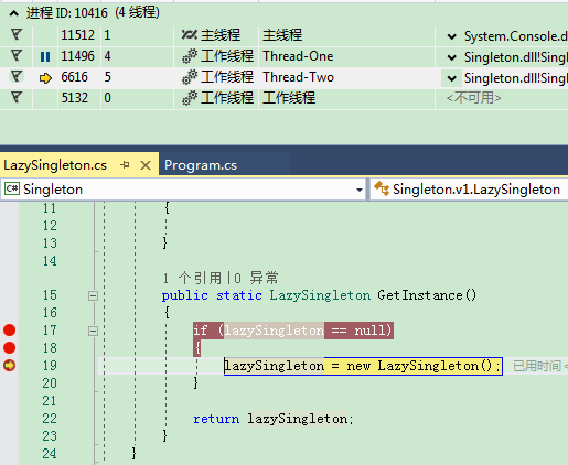 问题:该模式下在多线程下就会存在问题,因为你不知道线程执行的先后顺序,不信看下面的调试,如下。