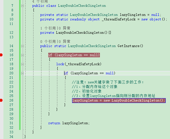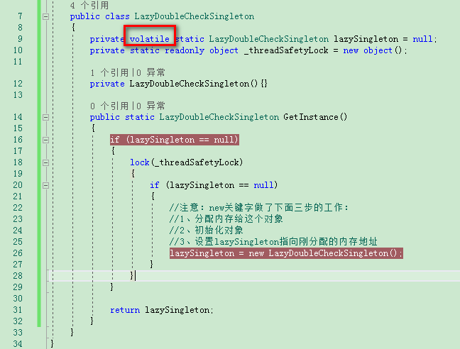{ private volatile static LazyDoubleCheckSingleton lazySingleton = null; private static readonly object _threadSafetyLock = new object(); private LazyDoubleCheckSingleton(){} public static LazyDoubleCheckSingleton GetInstance()