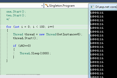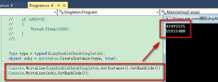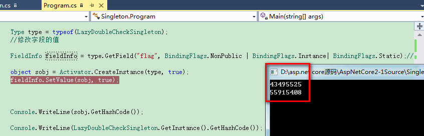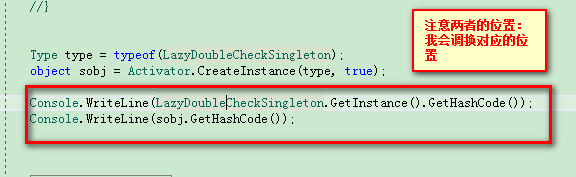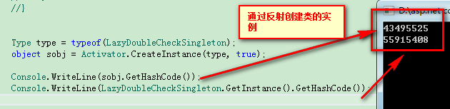 Type type = typeof(LazyDoubleCheckSingleton); object sobj = Activator.CreateInstance(type, true); Console.WriteLine(LazyDoubleCheckSingleton.GetInstance().GetHashCode()); Console.WriteLine(sobj.GetHashCode());