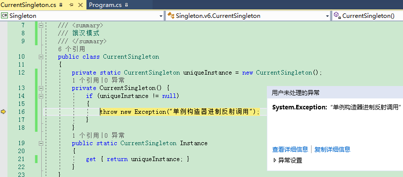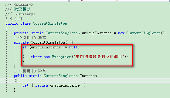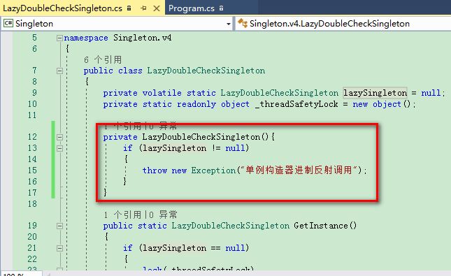 所以懒汉模式的单例,是防御不了反射攻击的,至于Java中有一个叫枚举模式的单例,可以解决这个问题,至于C#目前我还没想出好的解决办法,如果大家有好的解决办法可以贡献到评论区。好了问题一讲到这里已经差不多了,下面我们来介绍问题二。