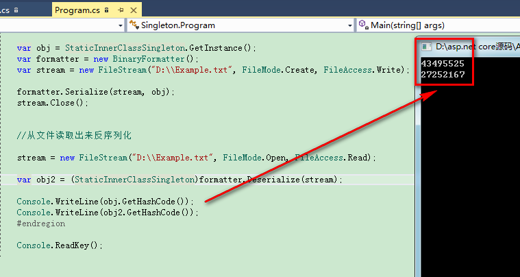 stream = new FileStream("D:\\Example.txt", FileMode.Open, FileAccess.Read); var obj2 = (StaticInnerClassSingleton)formatter.Deserialize(stream);