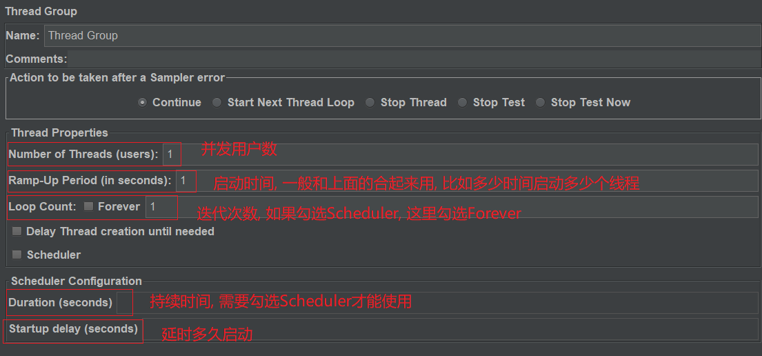 3. 添加线程组(user) : Test Plan --> Add --> Threads(Users) --> Thread Group, 这里还有setUp Thread Group和tearDown Thread Group, 前者是测试之前做的事, 后者是测试之后做的事. 这里点击Test Plan有个执行计划的设置比较常用, Run Thread Groups consecutively(i.e.one at time), 勾选表示顺序执行, 指的是测试计划中存在多个线程组时,第一个线程组执行完后再执行下一个线程组。下图是线程组的线程配置详情: