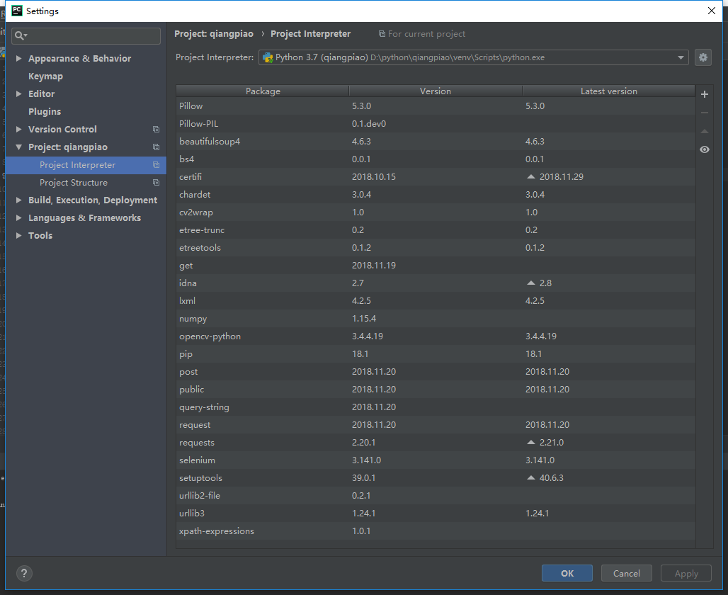 III.在I步骤的project Interpeter那里选择你加入的python路径,如出现pip、selenium、setuptools模块则代表成功了,可以使用selenium了
