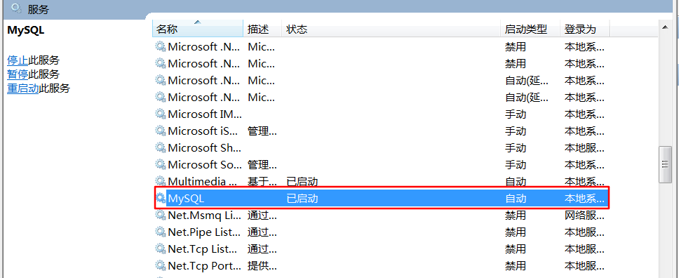 启动和关闭服务分别有两个命令:net start mysql(启动) net stop mysql(关闭)