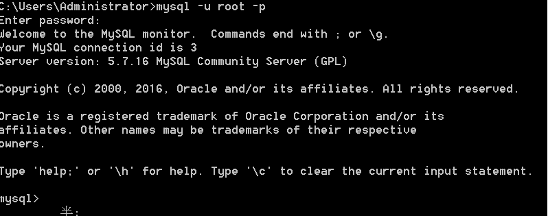 现在连接mysql服务器:在命令提示符输入mysql -u root -p 回车。