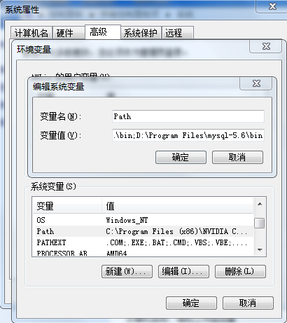 2.2,右击 我的电脑->属性->高级->环境变量,在系统变量里选择PATH,在其后面添加: mysql bin文件夹的路径 (如: D:\Program Files\mysql-5.6\bin ),注意是追加,不是覆盖