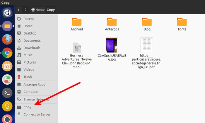 现在如果你想知道为什么要这么做,答案很简单。它可以让你可以快速地在左边栏中访问。比如,我在Ubuntu中安装了Copy 云服务。它创建在/Home/Copy。先进入Home目录再进入Copy目录并不是很麻烦,但是我想要更快地访问它。因此我添加了一个书签这样我就可以直接从侧边栏访问了。