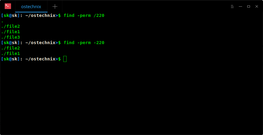 如你所见,命令行上显示两个文件。我们给 file2 设置了 766 权限,但是命令行显示两个文件,什么鬼?因为,我们设置了 - 参数前缀。它意味着这条命令将在所有文件中查找文件所有者的“读/写/执行”权限,文件用户组的“读/写”权限和其他用户的“读/写”权限。本例中,file1 和 file2 都符合要求。换句话说,文件并不一样要求时确切的 766 权限。它将会显示任何属于(高于)此权限的文件 。