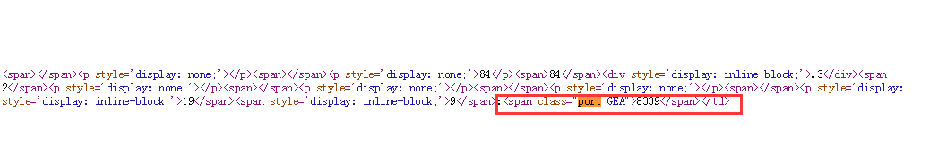 1 $(function() { 2 $(".port")["each"](function() { 3 var a = $(this)["html"](); 4 if (a["indexOf"]("*") != -0x1) { 5 return; 6 } 7 var b = $(this)["attr"]("class"); 8 try { 9 b = b["split"](" ")[0x1];10 var c = b["split"]("");11 var d = c["length"];12 var f = [];13 for (var g = 0x0; g < d; g++) {14 f["push"]("ABCDEFGHIZ"["indexOf"](c[g]));15 }16 $(this)["html"](window["parseInt"](f["join"]("")) >> 0x3);17 } catch (e) {}18 });19 });可以看到这段JS代码就是先找到每个端口节点,然后把端口的class值提取出来,再进行拆分字符串,然后获取每个字母在”ABCDEFGHIZ“中的下标值,并把这些值拼接成字符串,再转为整型数据,最后把这个整型数据向右移3位。比如”GEA“对应的下标组成的字符串是”640“,转为整型数据后向右移3位的结果就是80,也就是真实的端口值了。最后附上用Python解密端口号的代码: