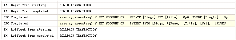 //修改数据 var blog = BloggingContext.Blogs.First(); blog.Title = "123"; //插入数据,再次插入违反约束 BloggingContext.Blogs.Add(new Blog() { Url = "www.baidu.com" }); BloggingContext.SaveChanges();检查数据库,该表数据没有做任何更改,通过sql 监听如下所示: